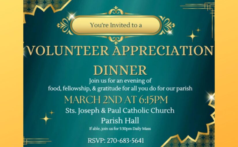 Volunteer Appreciation Dinner Feb 28, 2026 Please join us for a meal and fellowship to allow us to show you our gratitude for your time and talents you have shared with our parish! Share: Prev Next You Might Also Like 2 Mar 2026 “This is My Beloved Son, Listen to Him!” 11 Feb 2026 “You are the light of the world . . . Just so, your light must shine before others.” 20 Jan 2026 Behold, the Lamb of God who takes away the sin of the world